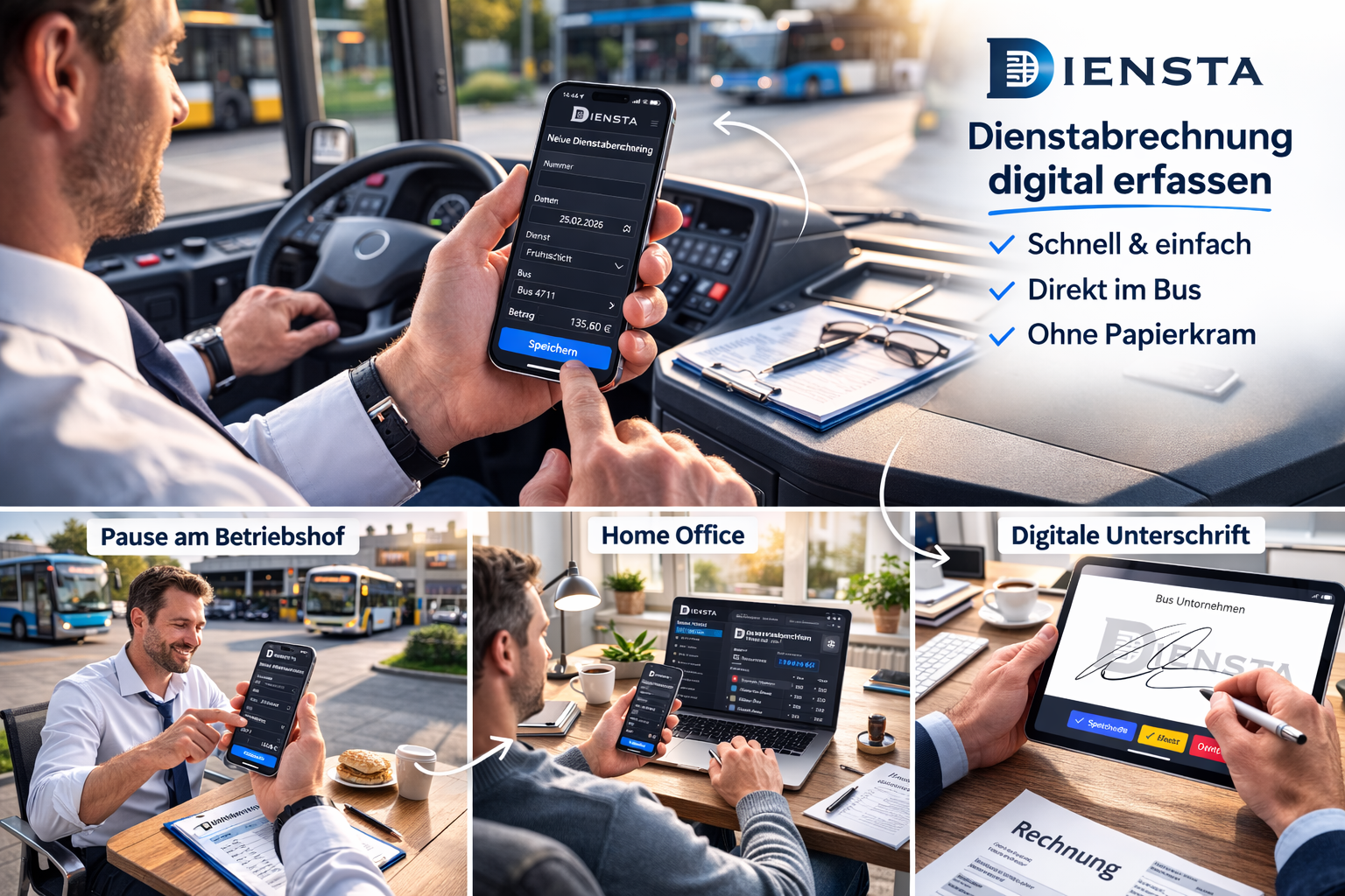 Erfasse deine Dienste direkt im Bus – ohne Zettel, ohne Stress. Diensta erstellt automatisch deine fertige Abrechnung.